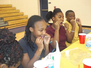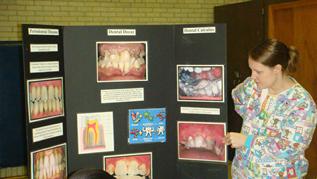 The dental health fair consists of a series of fun, hands-on activities, focusing on proper brushing and flossing techniques, the danger of tobacco use and soda pop consumption, the importance of good nutrition, and the use of mouthguards. Students interact with instructors and become involved in the learning process. They are given supplies to apply at home what was learned during the day long fair.